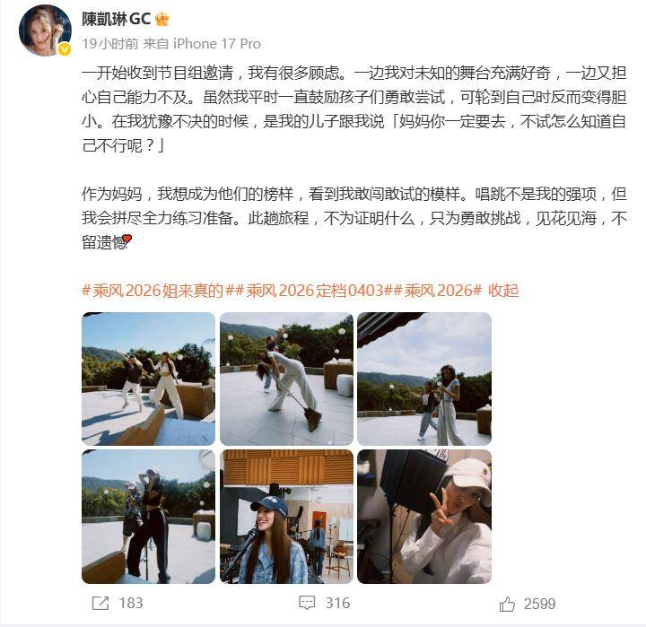 官宣消息中,陈凯琳没有大谈舞台梦想,反而坦诚分享了自己的纠结与怯懦。她透露,最初收到节目组邀请时,内心充满了矛盾:一边对未知的舞台充满好奇,另一边又深深担忧自己的能力不及。“虽然我平时一直鼓励孩子们勇敢尝试,可轮到自己时反而变得胆小。”这种“育儿道理都懂,自己实践却怂”的真实状态,瞬间戳中了许多妈妈网友的共鸣。